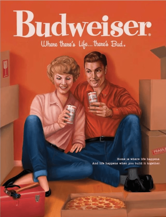 2. Budweiser beer ads have created ads that describe the changing role of gender over time. In a 1950s beer commercial, a woman pictured filling a man with a glass of alcohol and making an offering of support. At that time, this ad described a mother who supported her husband and was hard at raising her children. Afterward, the ads described the image as being made together like the second picture, not as one-sided, but moving forward together.